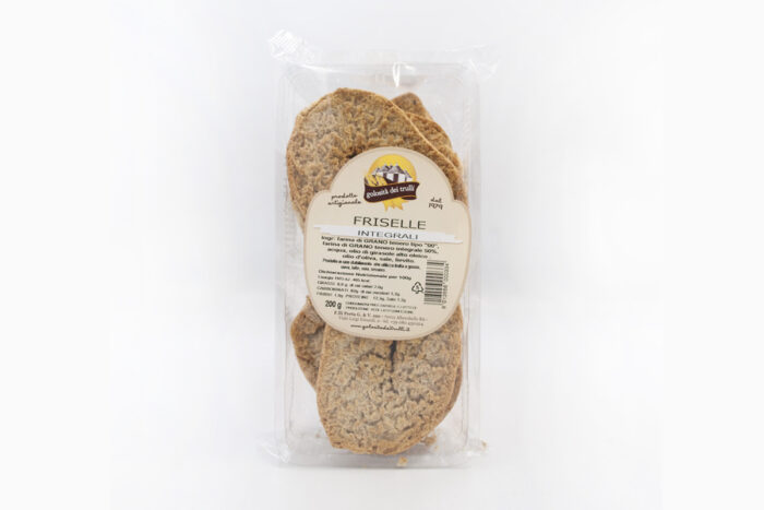 Tramandate dalle più antiche e incantevoli tradizioni Pugliesi, anche ad oggi, a distanza di tempo, le nostre Friselle Integrali sono rigorosamente le stesse, fatte di tre semplici ingredienti : farina, acqua e sale. Oggi come allora noi di Golosità dei trulli ci impegniamo nel onorare le tradizioni, offrendovi la qualità e croccantezza delle nostre più pregiate Friselle Integrali Pugliesi. Perfette sia come pasto unico che come spuntino, le nostre Friselle Integrali Pugliesi si sposano perfettamente con Olio e Pomodoro, regalandoti un’esperienza di sapore e appagamento indescrivibile.